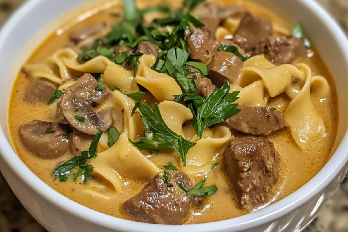 This Beef Stroganoff Soup transforms classic stroganoff into a hearty, one-pot meal perfect for cold nights. Tender beef, earthy mushrooms, and creamy broth combine with egg noodles for ultimate comfort food satisfaction in just under an hour.