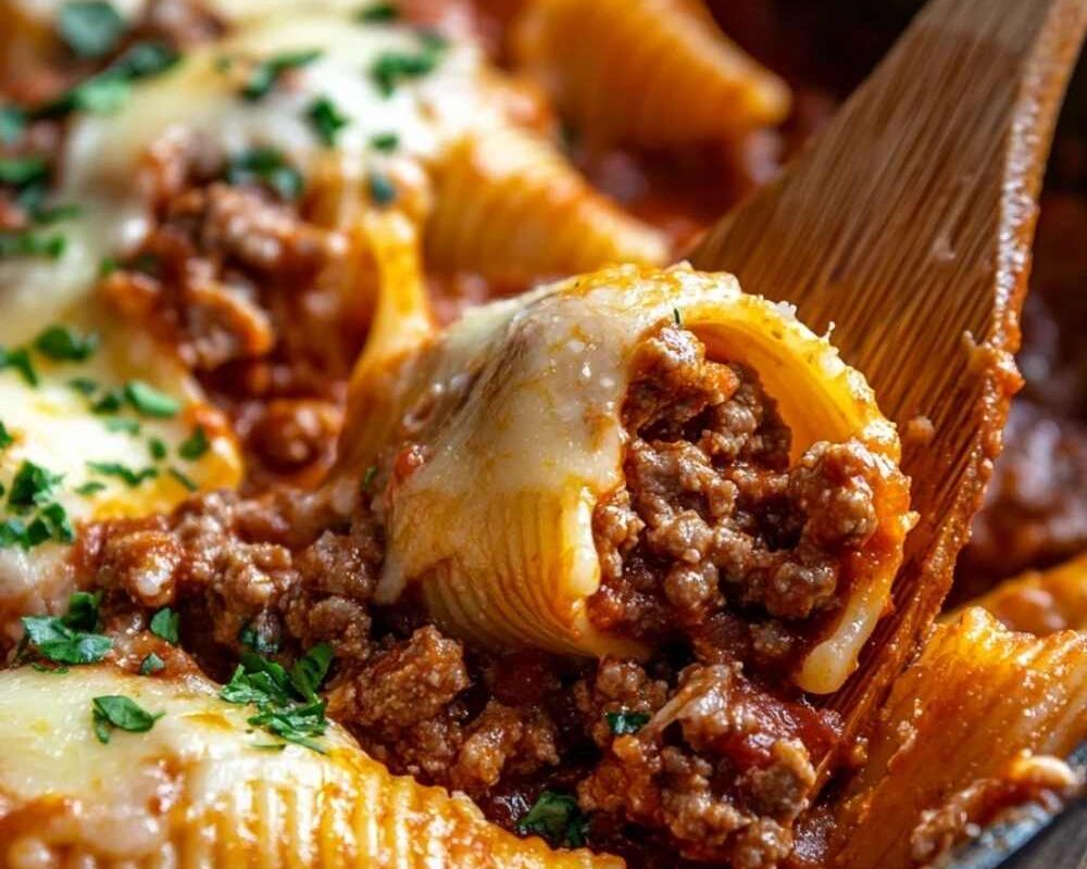 - Stuff the cooked pasta shells with the beef mixture.