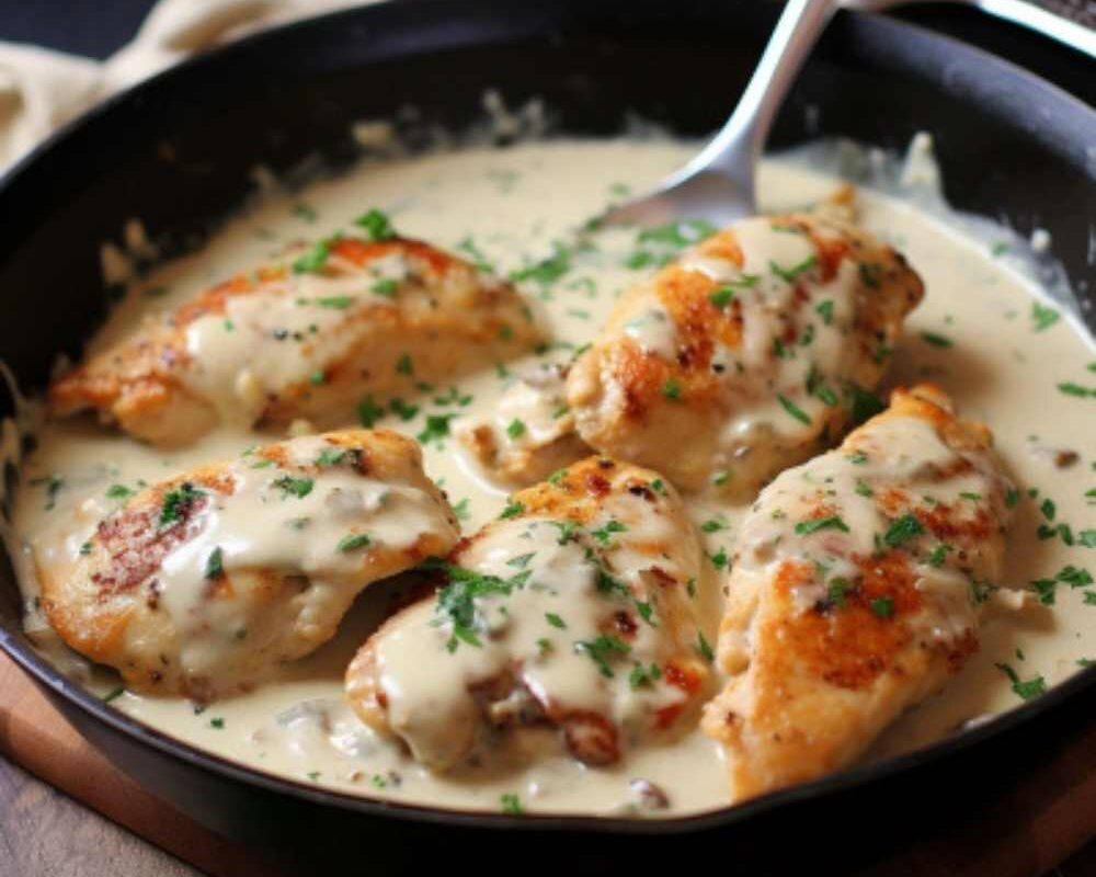 Serve the creamy garlic chicken hot, garnished with your choice of chopped parsley, dill, or thyme.