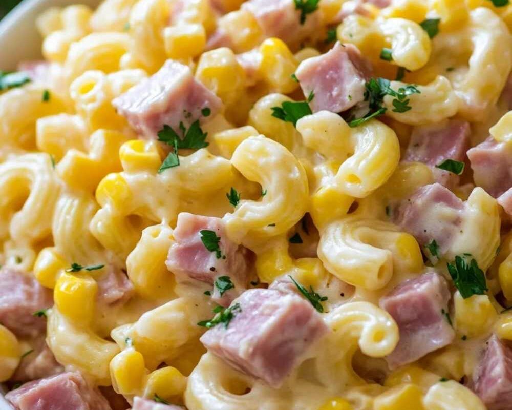 - In a large bowl, combine the cooled pasta, diced ham, and drained corn.