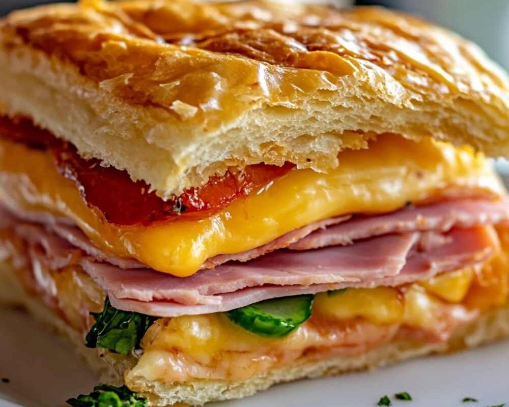 - Start layering the fillings: place 6 slices of mozzarella cheese on the flattened pastry, followed by the deli ham and turkey.