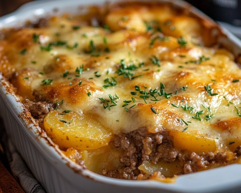 Remove your Cheesy Hamburger Potato Casserole from the oven and let it rest for 5-10 minutes. This resting period allows the layers to set slightly, making it easier to serve clean portions. The internal temperature should reach 165°F for food safety.