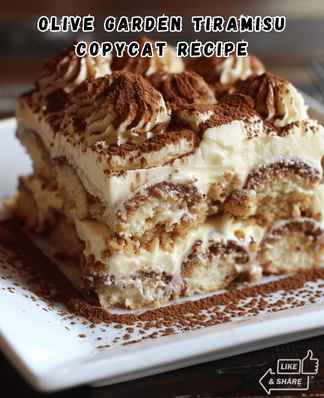 Enjoy this decadent Olive Garden-inspired tiramisu, a perfect blend of creamy mascarpone, robust espresso, and delicate ladyfingers, all topped with a dusting of cocoa.