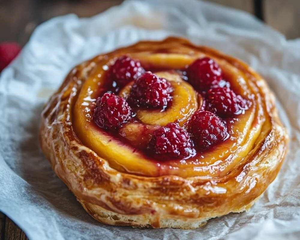 - Brush the dough with the egg wash (egg yolk mixed with water) and spoon the raspberry mixture into the center of each Danish.